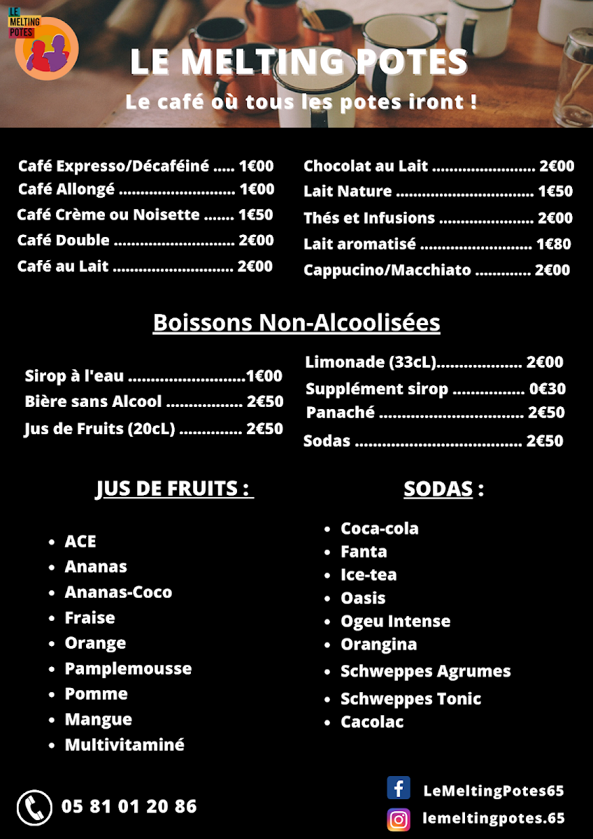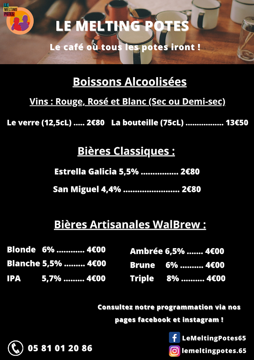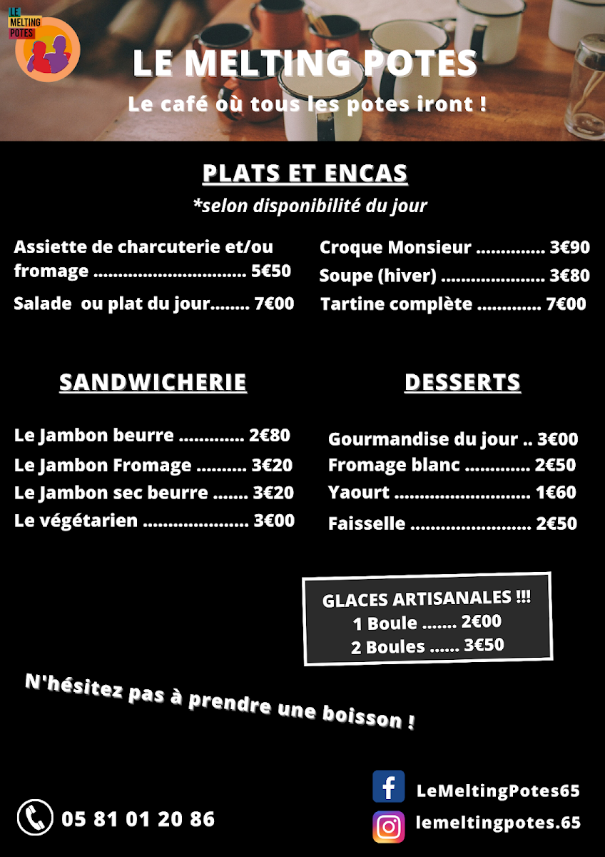 Welcome to Le Melting Potes, a charming café located at 7 Av. de la Marne in Tarbes, France. This cozy establishment is not just about delicious food and drinks, but also about fostering connection and community. The menu features a delightful range of beverages, from rich espresso options starting at just €1.00 to exquisite wines available by the glass or bottle for a perfect dining experience.